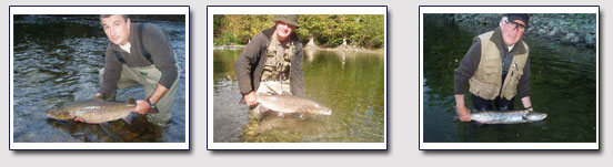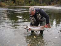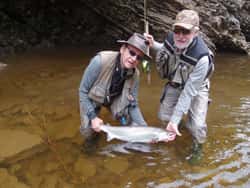 Profitant d'une accalmie, m'aidant d'une bonne traction de la main gauche, j'arrivai à poser ma mouche à l'endroit indiqué et la réponse ne se fit pas attendre. Un gobage, suivi d'un ferrage retardé (dur lorsqu'on est habitué à pêcher la truite ! ), et un premier rush. Aussitôt, Gilbert me fit rembobiner le reste de soie sorti du moulinet afin de continuer le combat au moulinet. J'espérais que le poisson était bien piqué ! Le saumon sonda à nouveau pour rejoindre le fond de la fosse, me sortant rapidement toute la soie du moulinet, malgré la tension importante que j'appliquais. Par chance, il n'avait pas décidé de partir vers l'aval, préférant combattre au milieu de notre si belle fosse. Je repris, peu à peu, plusieurs mètres de soie et pusapercevoir enfin mon poisson, sous 3 mètres d'eau claire. Il n'était pas très gros, mais je commençais tout de même à avoir mon avant-bras tétanisé, peut-être aussi à cause de l'excitation, et craignais à chaque départ de le perdre. Afin de réduire le combat pour pouvoir faire une remise à l'eau efficace, j'accentuai la tension. Le saumon se rendit enfin et Gilbert le saisi par la queue, en veillant bien à laisser au maximum sa gueule dans l'eau le temps d'une séance photo bien méritée.