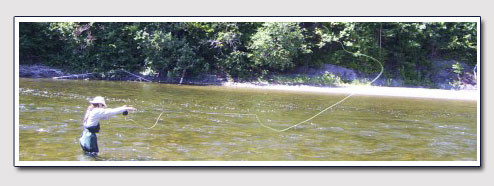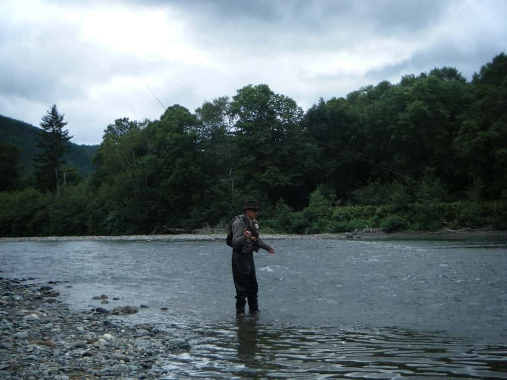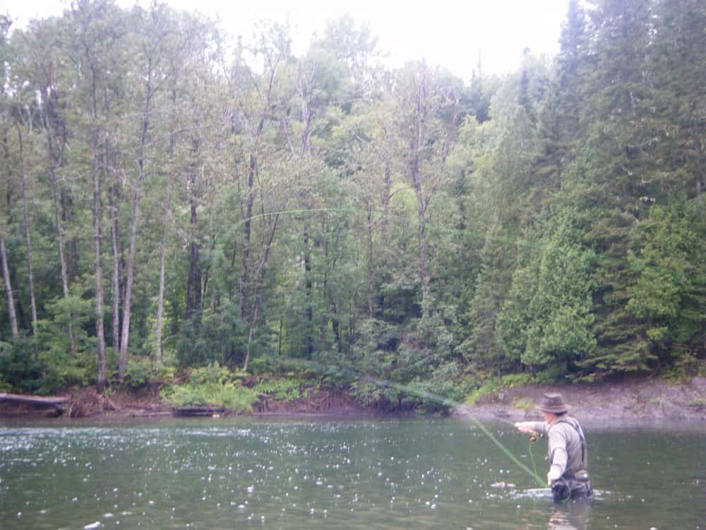 Le lendemain matin, Gilbert nous enseigna le principe de la pêche au saumon ainsi que la technique particulière de la mouche sèche : le saumon ne se nourrissant plus en rivière, il prend la mouche par agressivité et se déplace peu pour saisir un leurre. Les posés doivent donc être précis et les dérives relativement courtes (3 à 4 secondes environ).